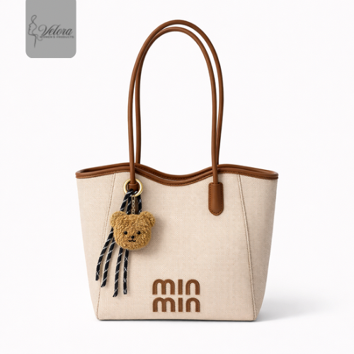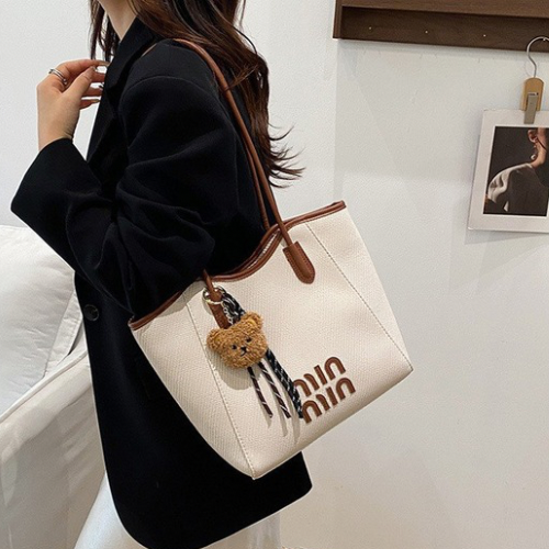 Large open top style with zipper closure, dual shoulder handles, and soft bear charm hanging from the handle.