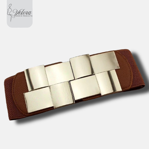 Brown elastic belt with leather details and a twisted gold-tone buckle